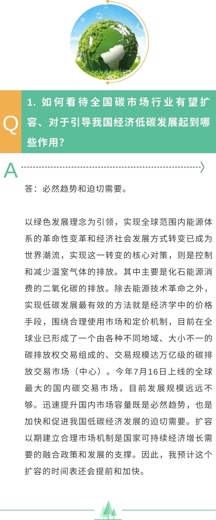 问题:如何看待全国碳市场行业有望扩容,对于引导我国经济低碳发展起到哪些作用?对于相关行业的高能耗企业而言,参与到全国碳市场有哪些好处?