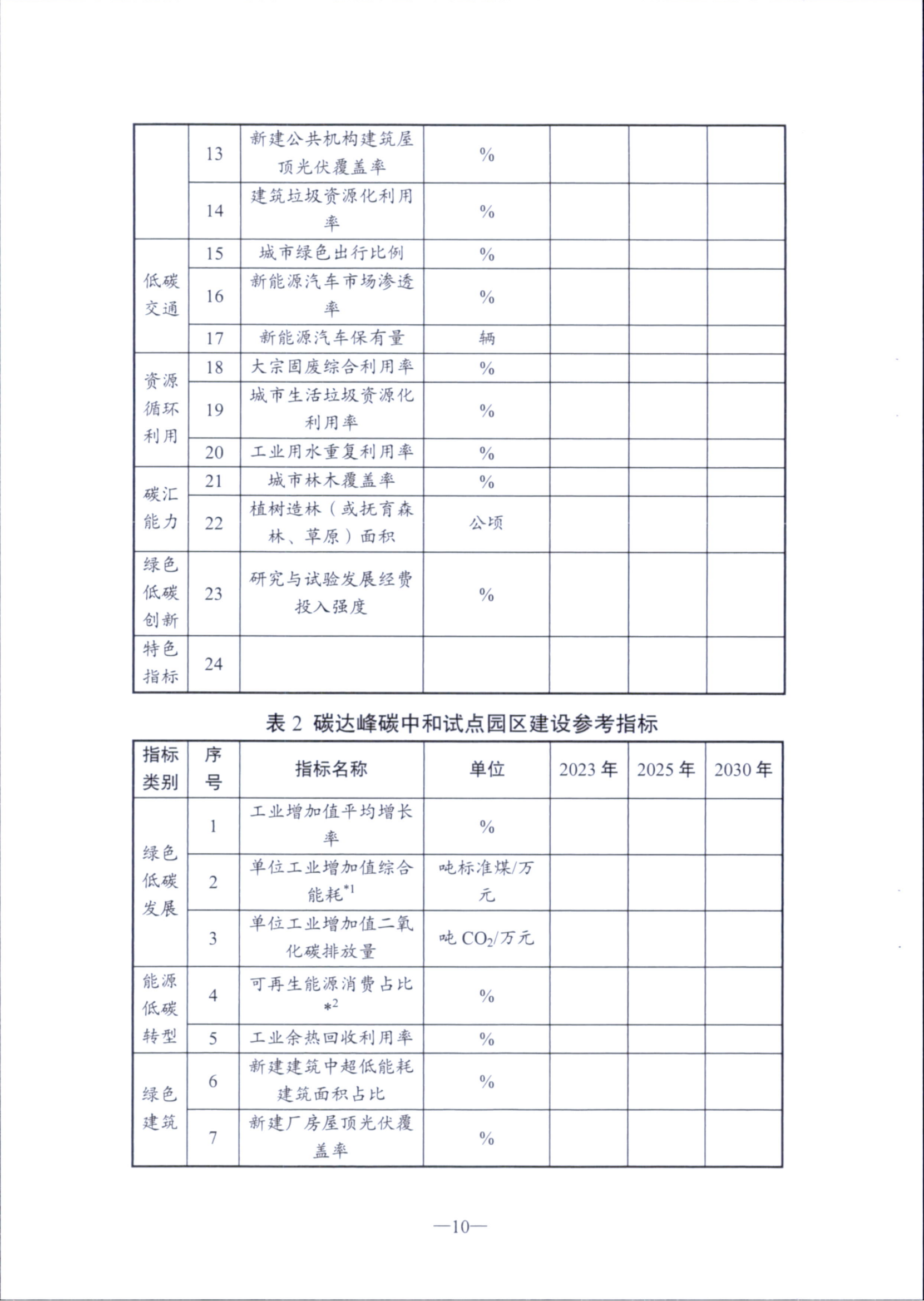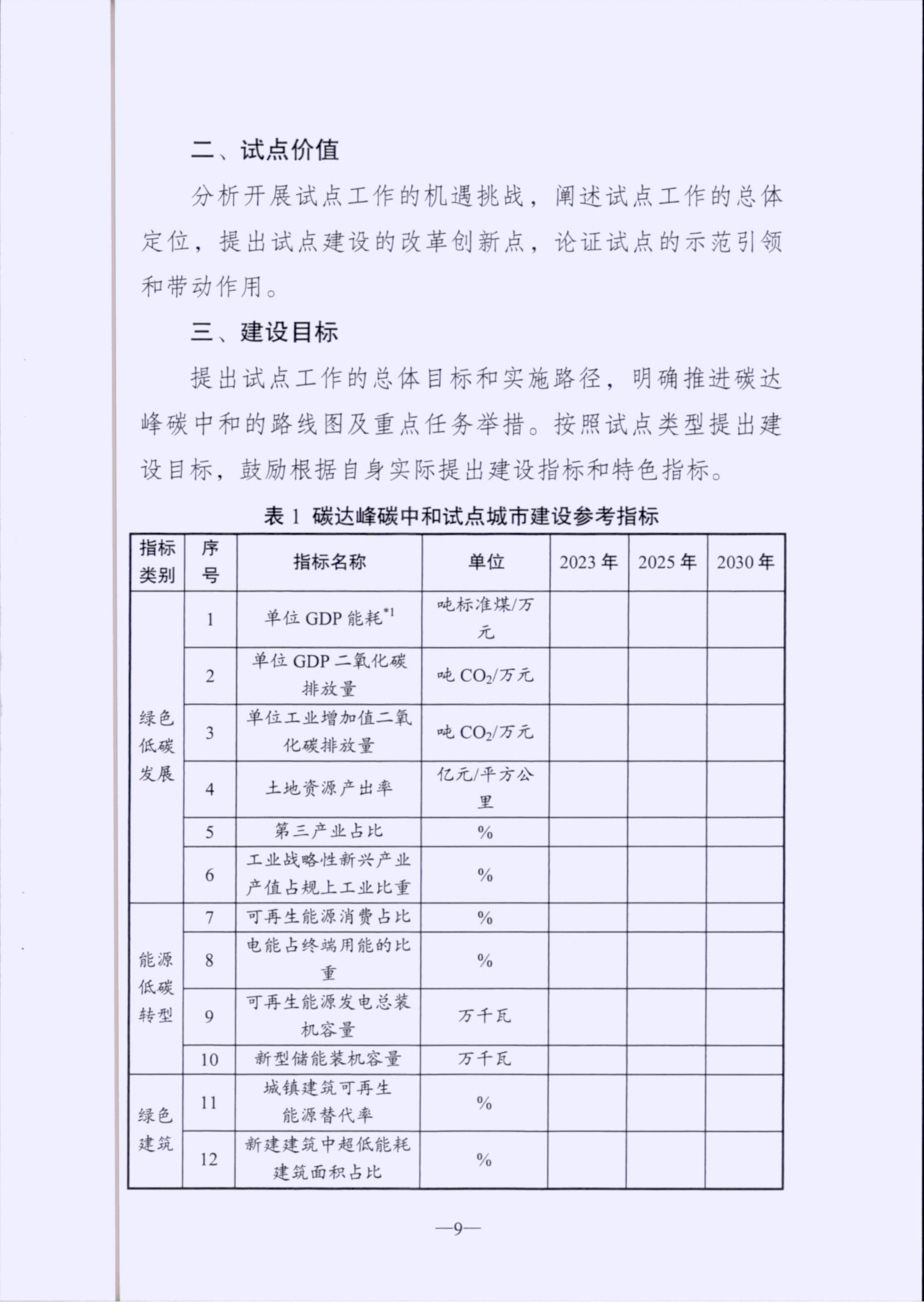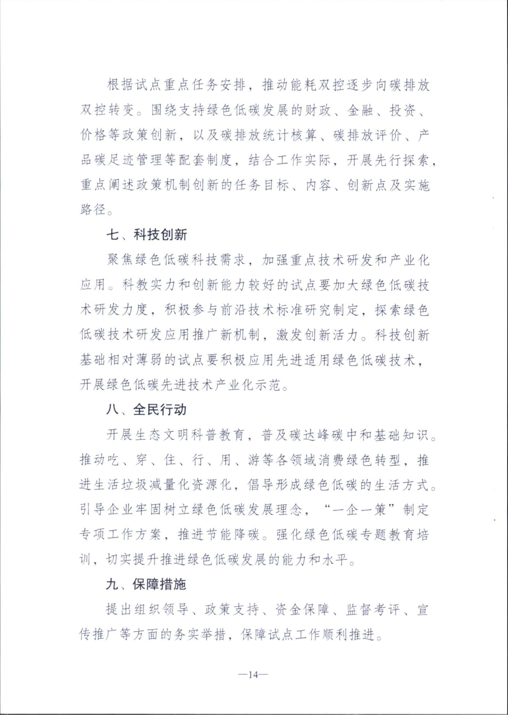 1.城市试点。城市试点面向各县(市、区)开展建设工作。围绕城市碳达峰碳中和目标,强化总体设计和统筹协调,推动能耗双控逐步向碳排放双控转变,选择工业、能源、城乡建设、交通运输、科技创新、低碳社会等重点领域实施专项行动,率先探索城市碳达峰碳中和实现路径。