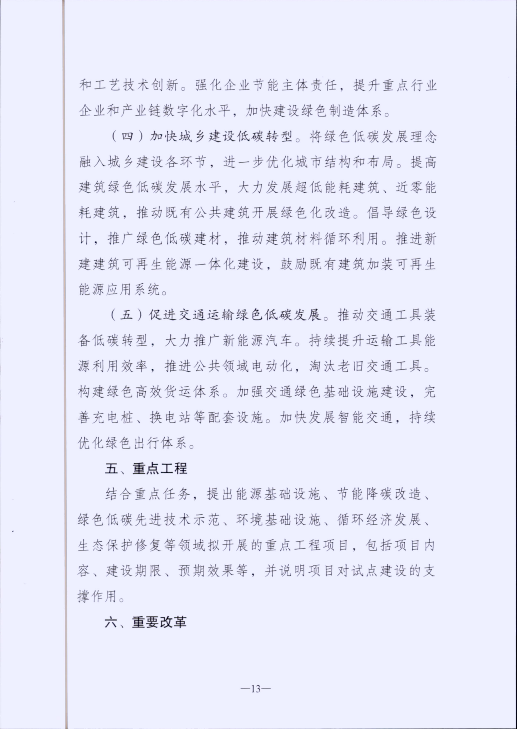根据全省碳达峰碳中和工作部署和任务安排,立足资源禀赋、产业布局、发展阶段等基础条件,深入分析绿色低碳转型面临的关键制约,围绕能源绿色低碳转型、产业优化升级、节能降碳增效、绿色科技创新、绿色低碳全民行动以及交通、城乡建设等重点领域低碳发展,提出符合实际、切实可行的试点建设任务。