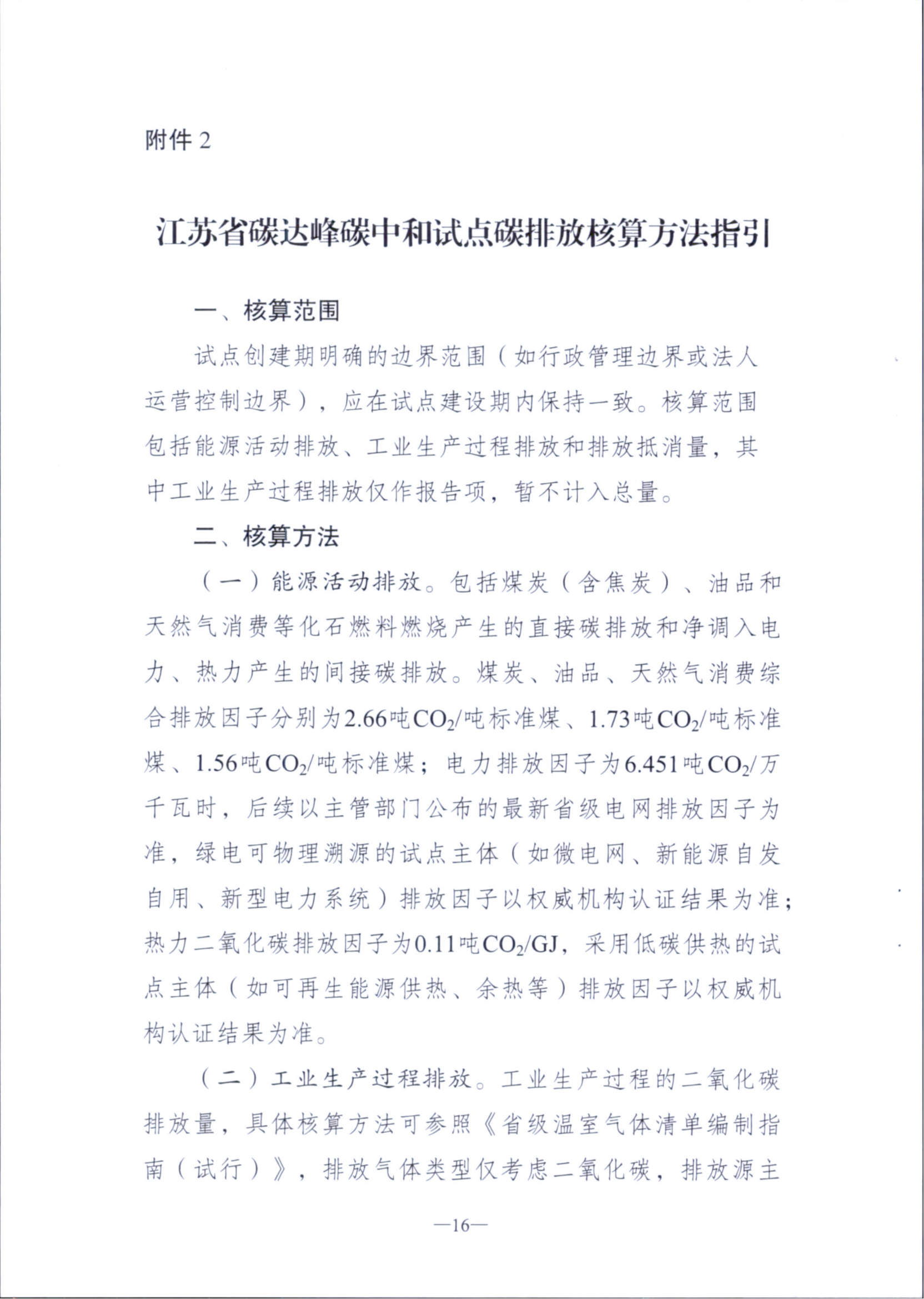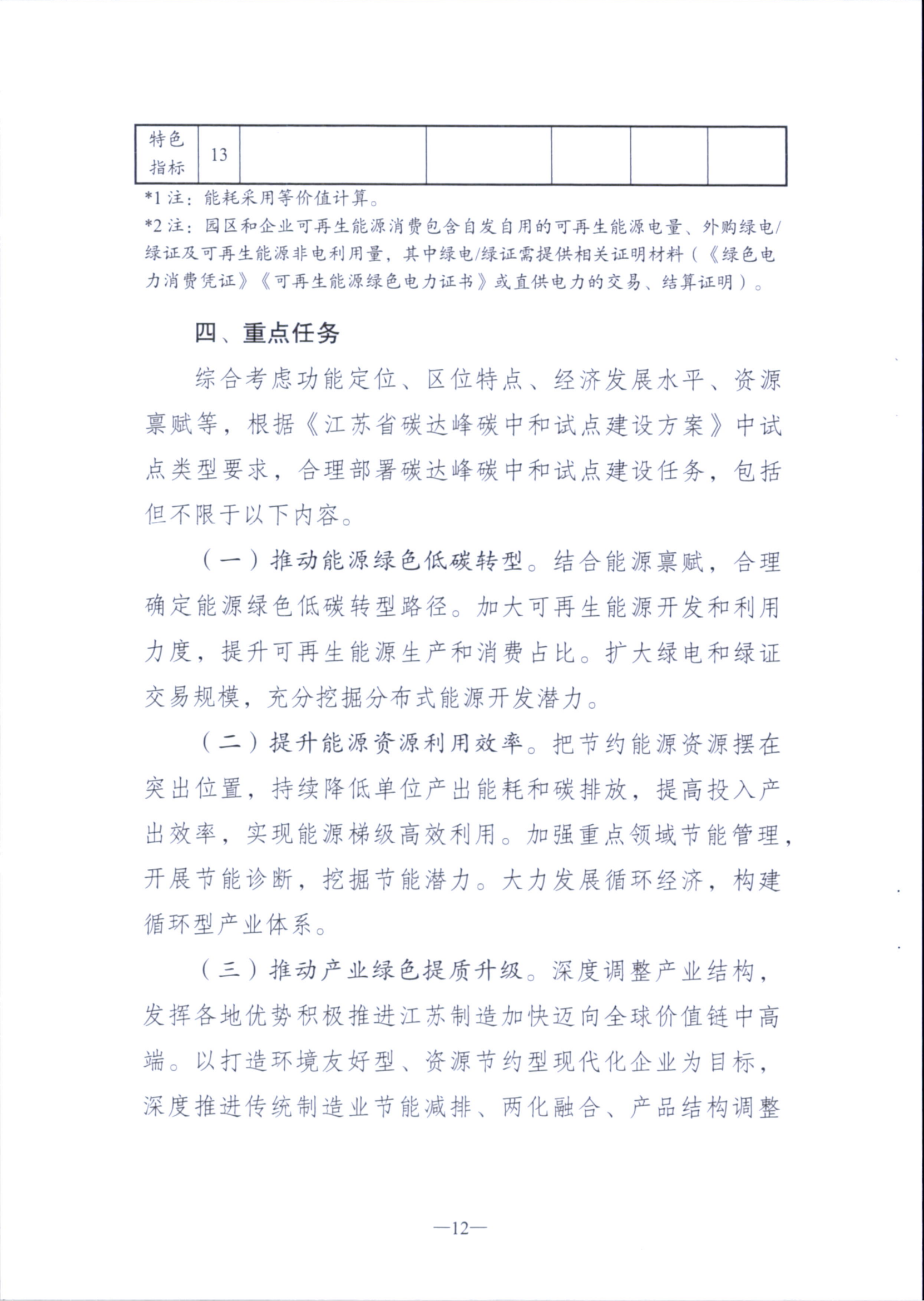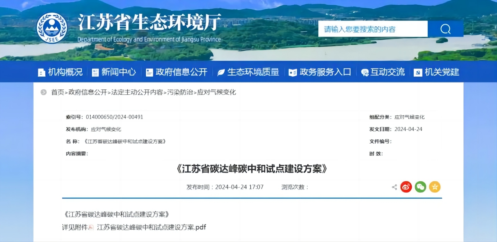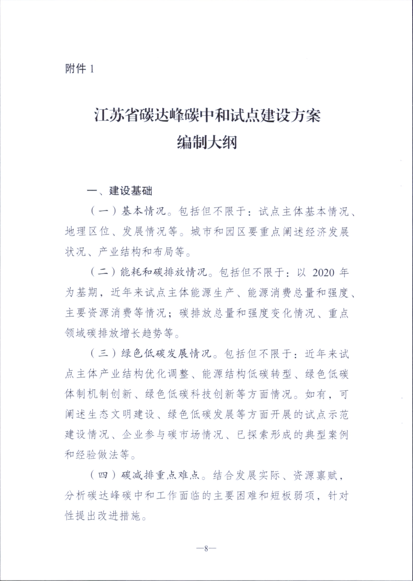 为落实江苏省委、省政府《关于推动高质量发展做好碳达峰碳中和工作的实施意见》《江苏省碳达峰实施方案》有关部署要求, 组织开展城市、园区、企业碳达峰碳中和试点建设,有效发挥不同主体的主动性和创造性,加快发展方式绿色转型,形成一批可操作可复制可推广的发展模式和典型经验,江苏省发改委、财政厅、生态环境厅联合发布《江苏省碳达峰碳中和试点建设方案》。